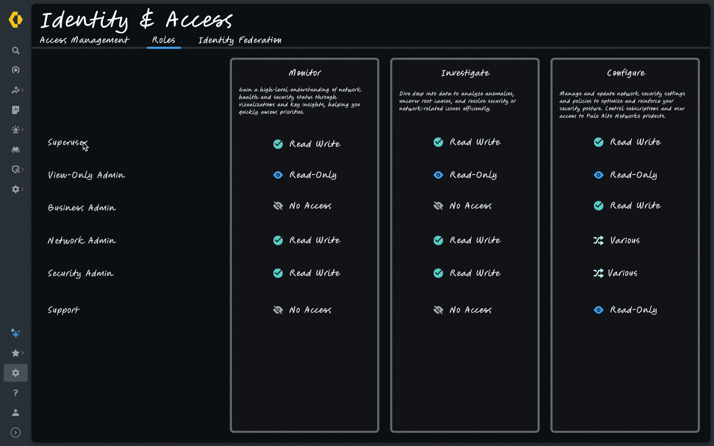Inconsistent role models across apps: Custom roles were only implemented in a few applications like Prisma Access, Strata Logging Service, Shared Services, and CASB. Many teams created their own predefined roles, resulting in a fragmented access model.